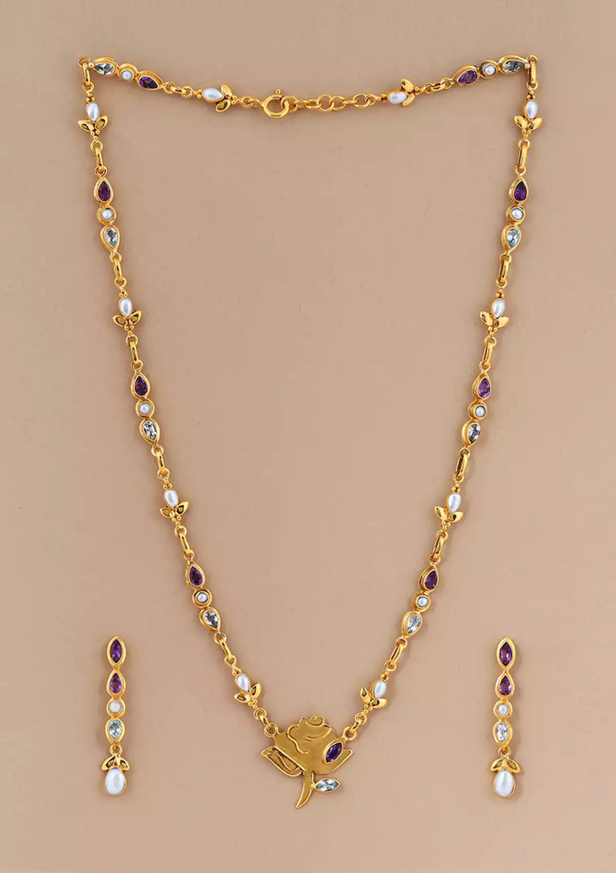 Made with pure 925 sterling silver, these gold-plated silver earrings feature natural stones like Amethyst, Blue Topas, and pearls with a push-back closure.