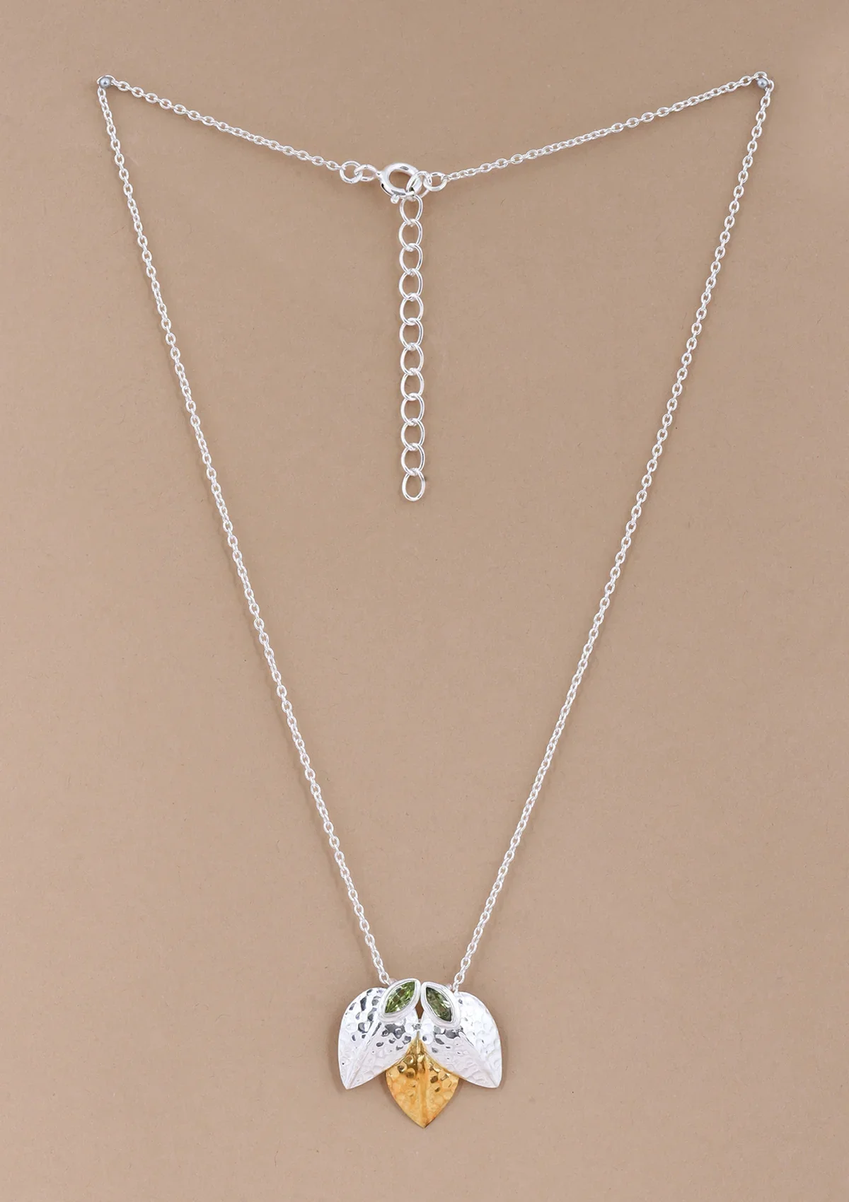 - This silver and gold-finish hammered pendant necklace is triple-toned with a 3-leaf-shaped pendant and radiant peridot stones that add a subtle sparkle.