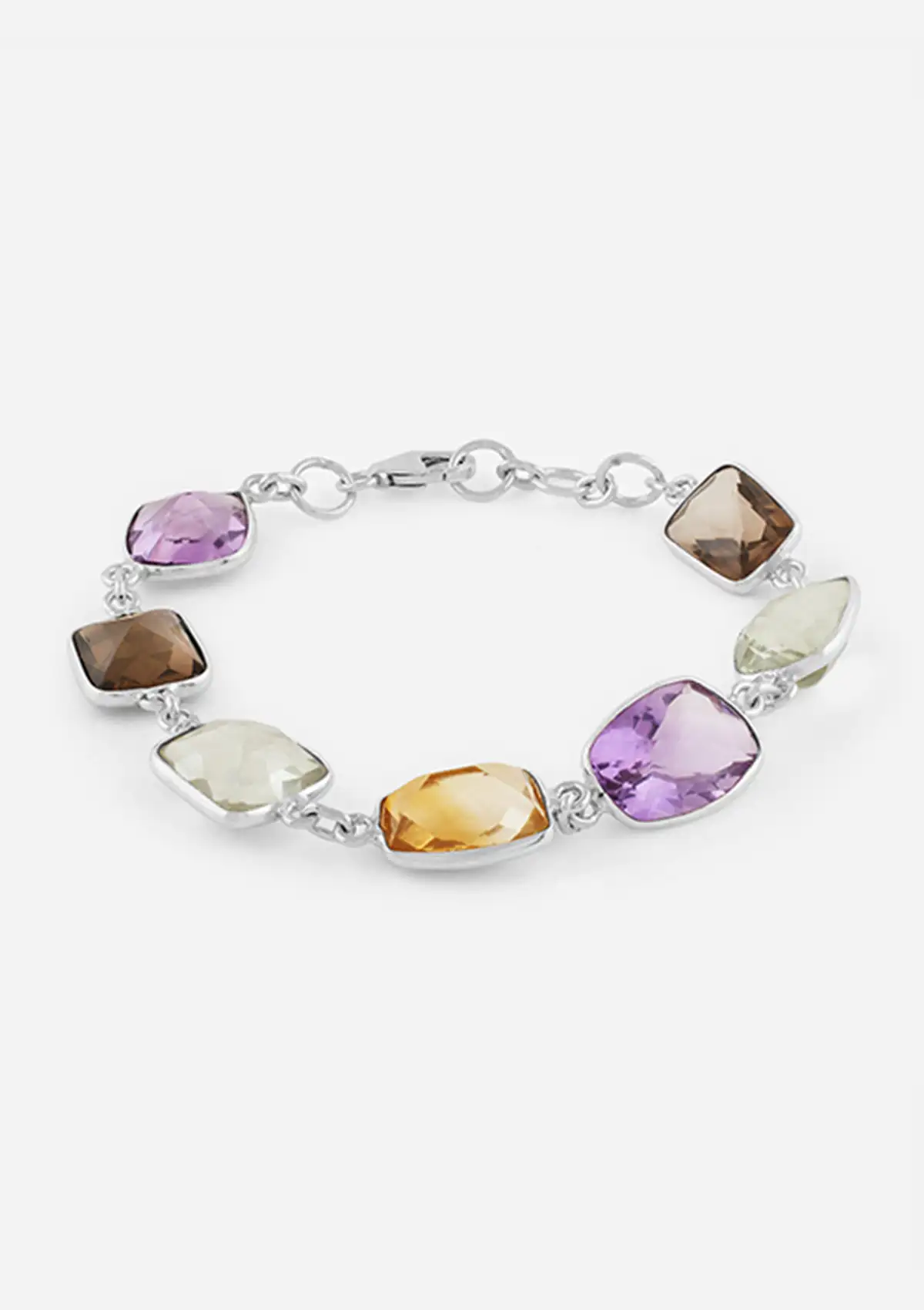 A stunning, chic design, this 925 sterling silver bracelet features natural gemstones such as Amethyst, Citrine, Green Amethyst and Smokey Topaz that gives it a luxe finish. A statement piece, this bracelet is perfect to add some pizazz to your everyday look. Match this with our Silver Multicoloured Stone Danglers to dress up any outfit.