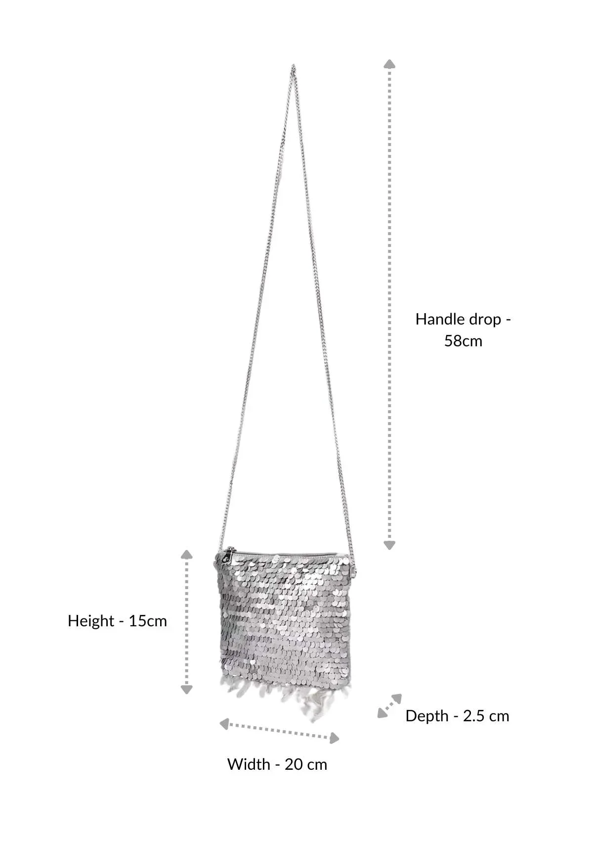 Make a statement with our stunning silver sequin bag for women, embellished with soft feather fringes along the bottom.