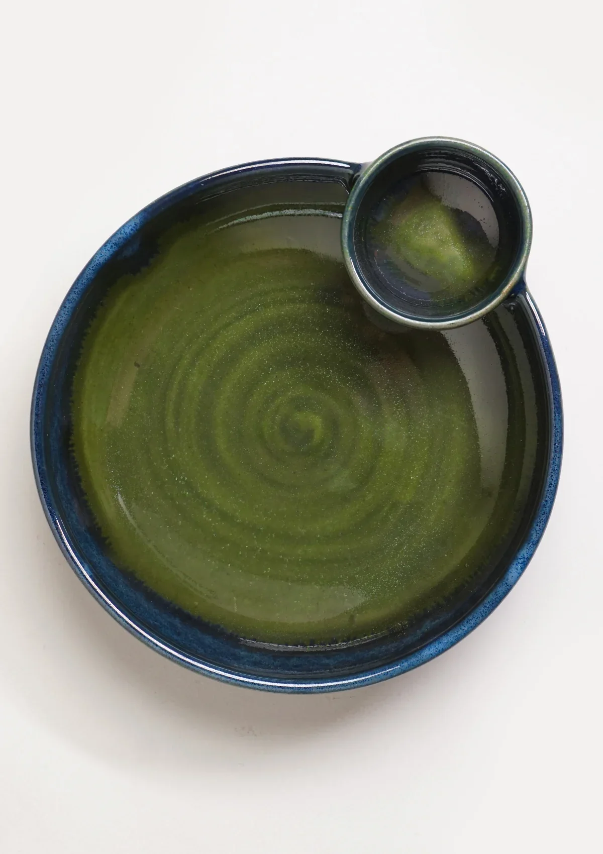 Let this handcrafted platter in dark blue and a earthy green centre brings the art of living into every meal. Enjoy your MEtime snack in this beautifully glazed artisanal snack bowl.